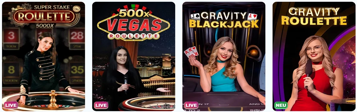 Unser Live Casino wird von Evolution Gaming betrieben und bietet authentische Casino-Atmosphäre. Professionelle Live-Dealer führen die Spiele in Echtzeit durch hochauflösende Videostreams.