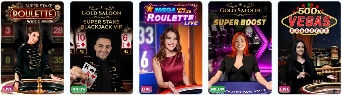 Alle live spellen hebben real-time interactie met dealers via chat functie. Minimum inzetten starten vanaf €1 met VIP tafels tot €5.000 per ronde.